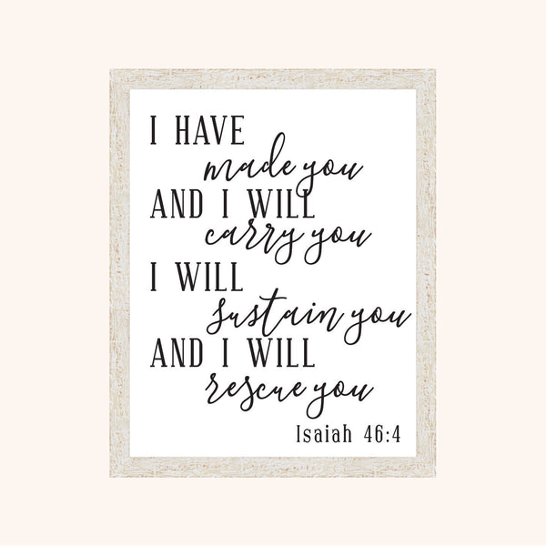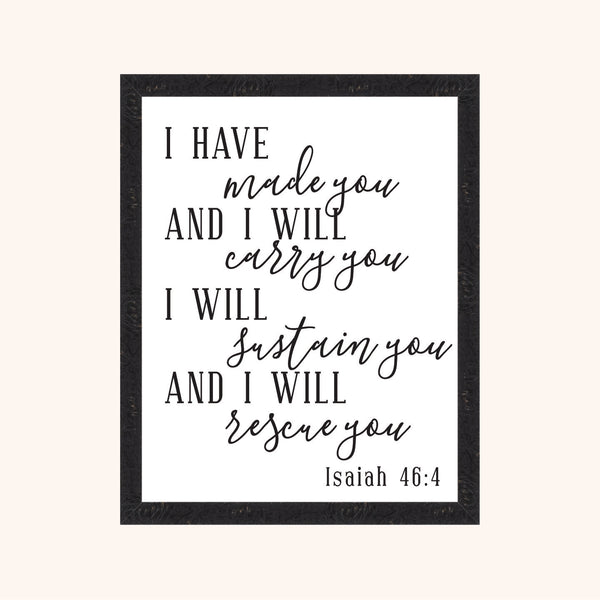 Bring peace and reassurance into your space with this beautifully framed Isaiah 46:4 Scripture Sign. Featuring the powerful words “I have made you, and I will carry you; I will sustain you, and I will rescue you,” this piece serves as a daily reminder of faith, strength, and God’s unfailing presence.